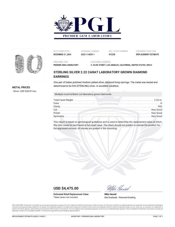 Elevate your collection with these stunning 2.22 carat VS clarity lab-grown diamond hoop earrings, crafted in fine sterling silver. With a modern round cut and H color grade, these hoops deliver brilliance and timeless sophistication. Designed for the woman who appreciates refined sparkle, they make the perfect statement piece for day or night. PGL Digital Appraisal included (Retail Value $4,475).